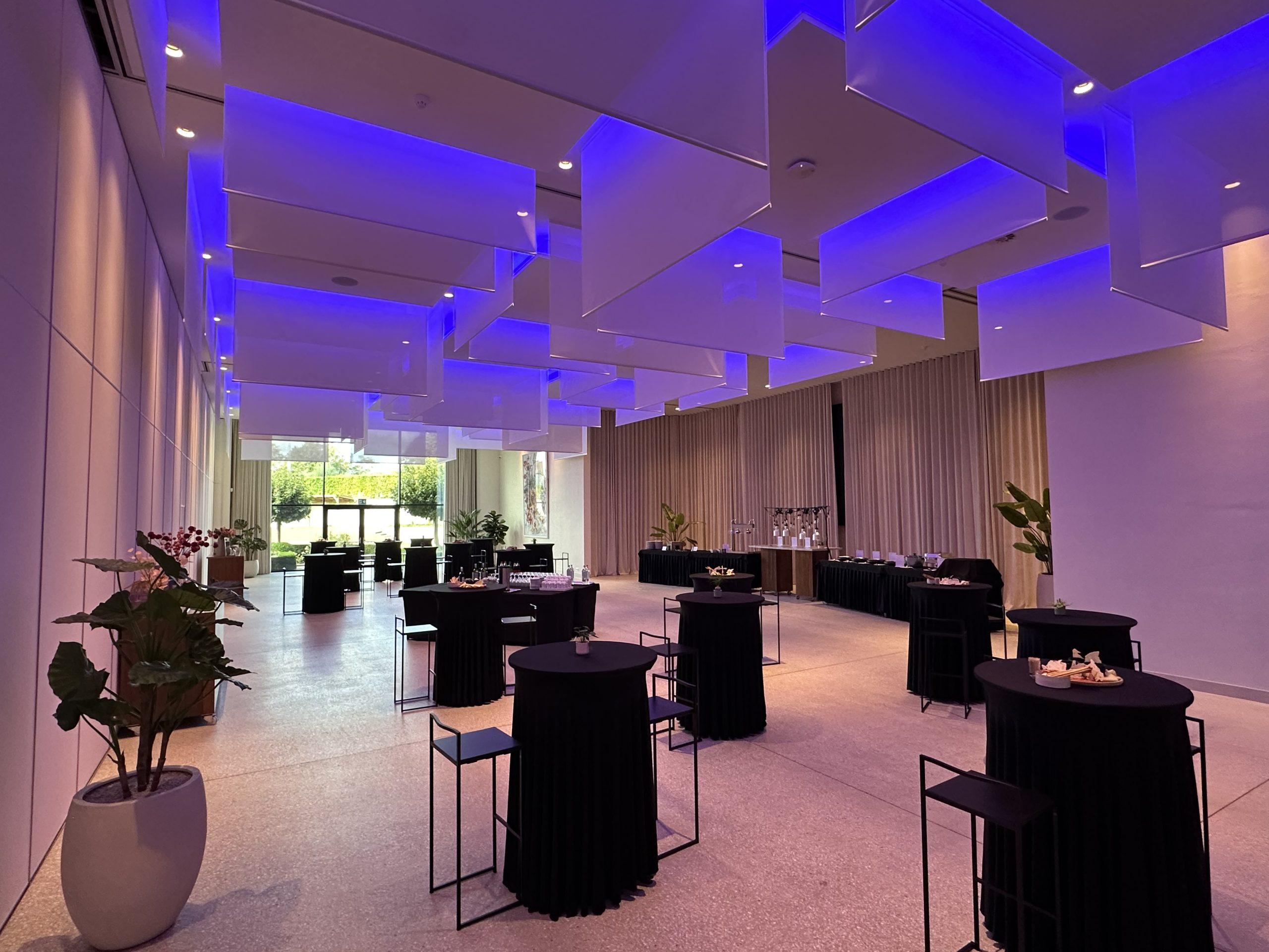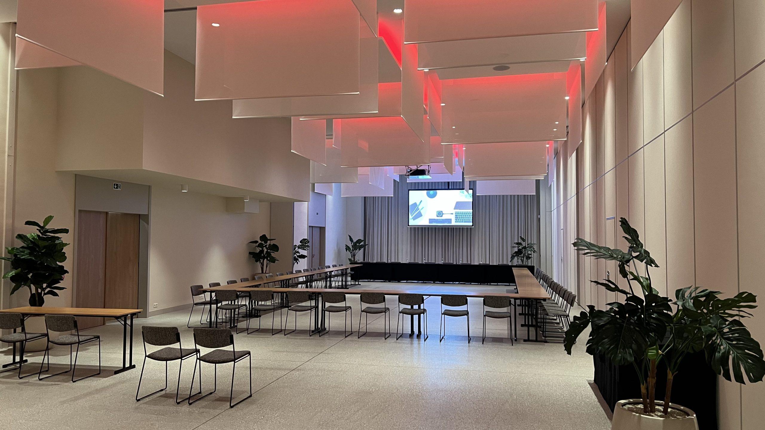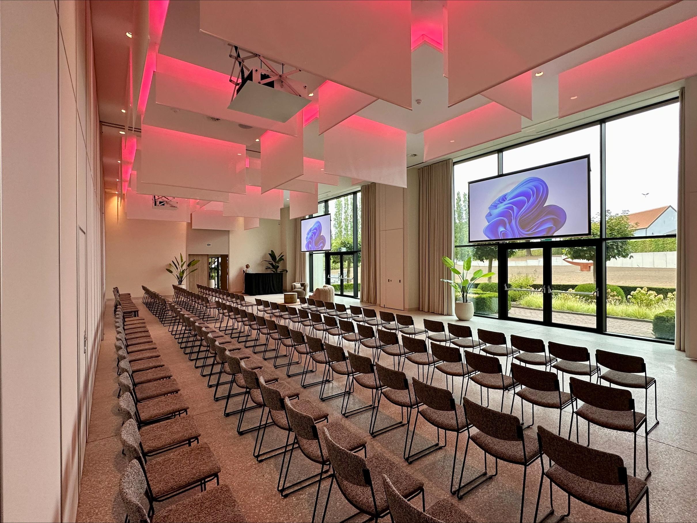 Elke zaal is aangenaam ingekleed en is voorzien van sfeervolle ledverlichting die u kan dimmen of uitschakelen in functie van uw presentatie. Het klimaat kan tevens geregeld worden in functie van uw wensen.
