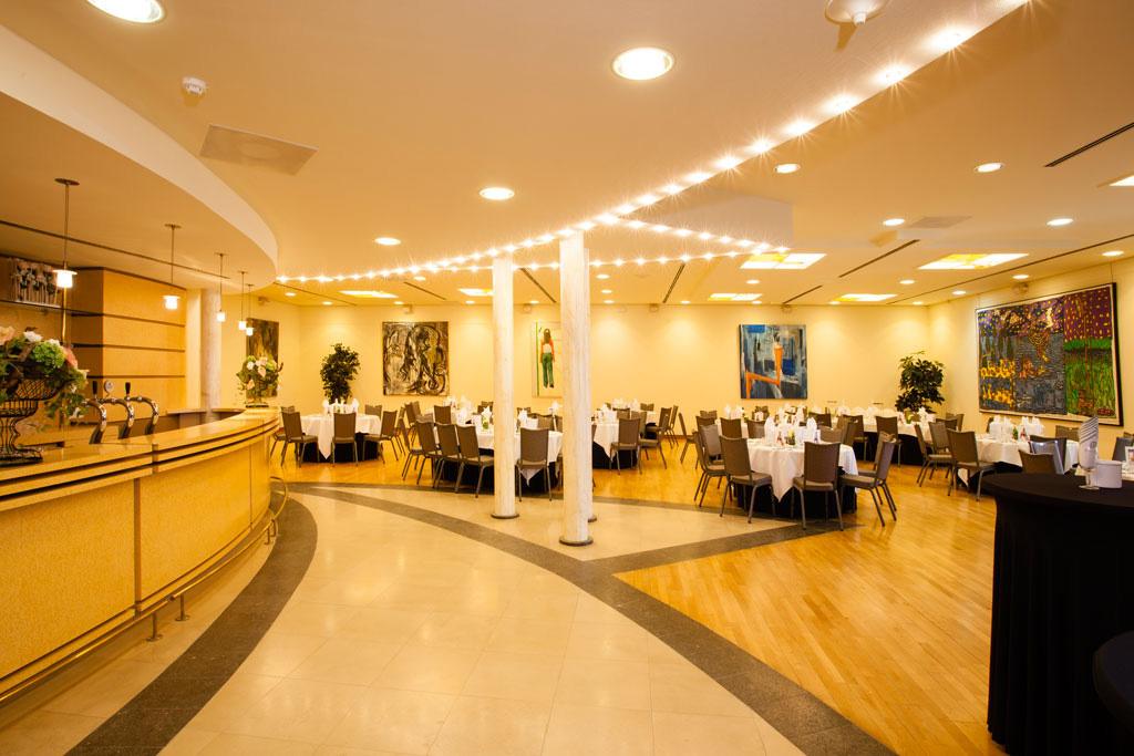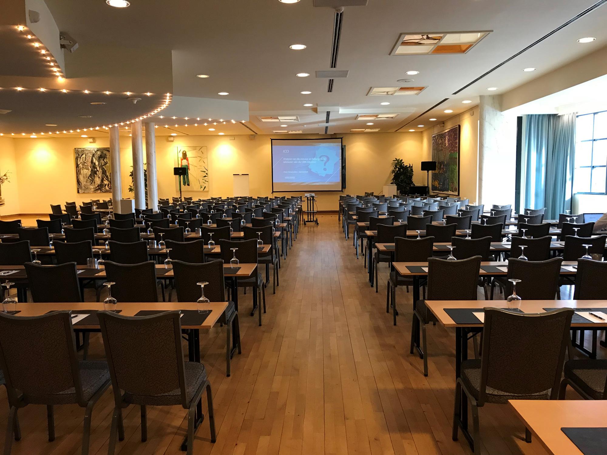 Multifunctionele zaal met parket gelegen op het gelijkvloers. De raampartijen zorgen voor een natuurlijke lichtinval. Doch is de zaal volledig verduisterbaar zodat uw presentatie in de meest optimale situatie kan plaatsvinden. Geschikt voor allerhande bijeenkomsten zoals lezingen, presentaties, vergaderingen, workshops, diners, enz. Door de geïntegreerde bar biedt deze zaal de mogelijkheid om vergaderen en een after-work drink te combineren of is deze uitermate geschikt voor uw receptie, personeelsfeest, enz.