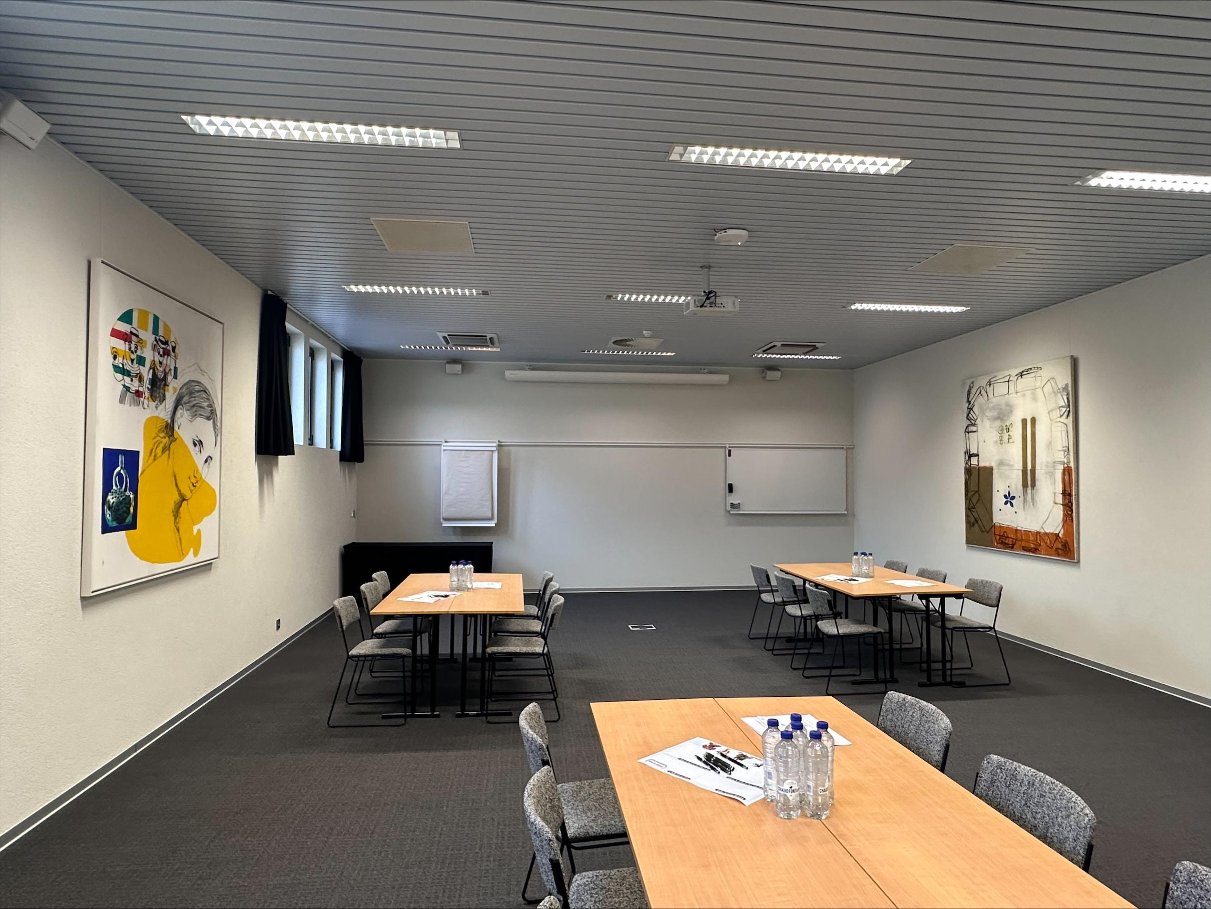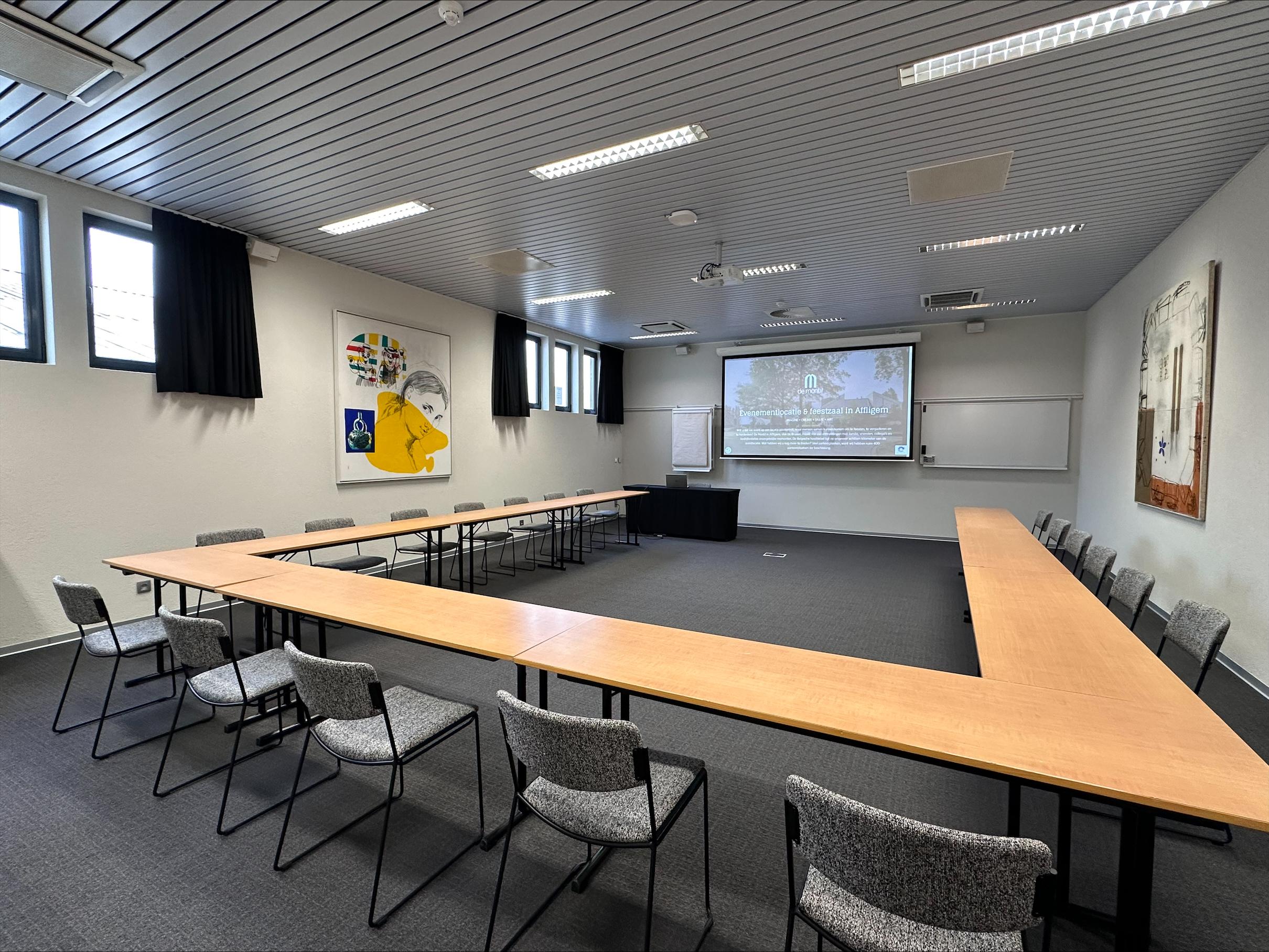 De vele ramen zorgen voor een natuurlijke lichtinval. Doch kan deze zaal volledig verduisterd worden waardoor uw presentatie in de meest optimale situatie kan plaatsvinden.