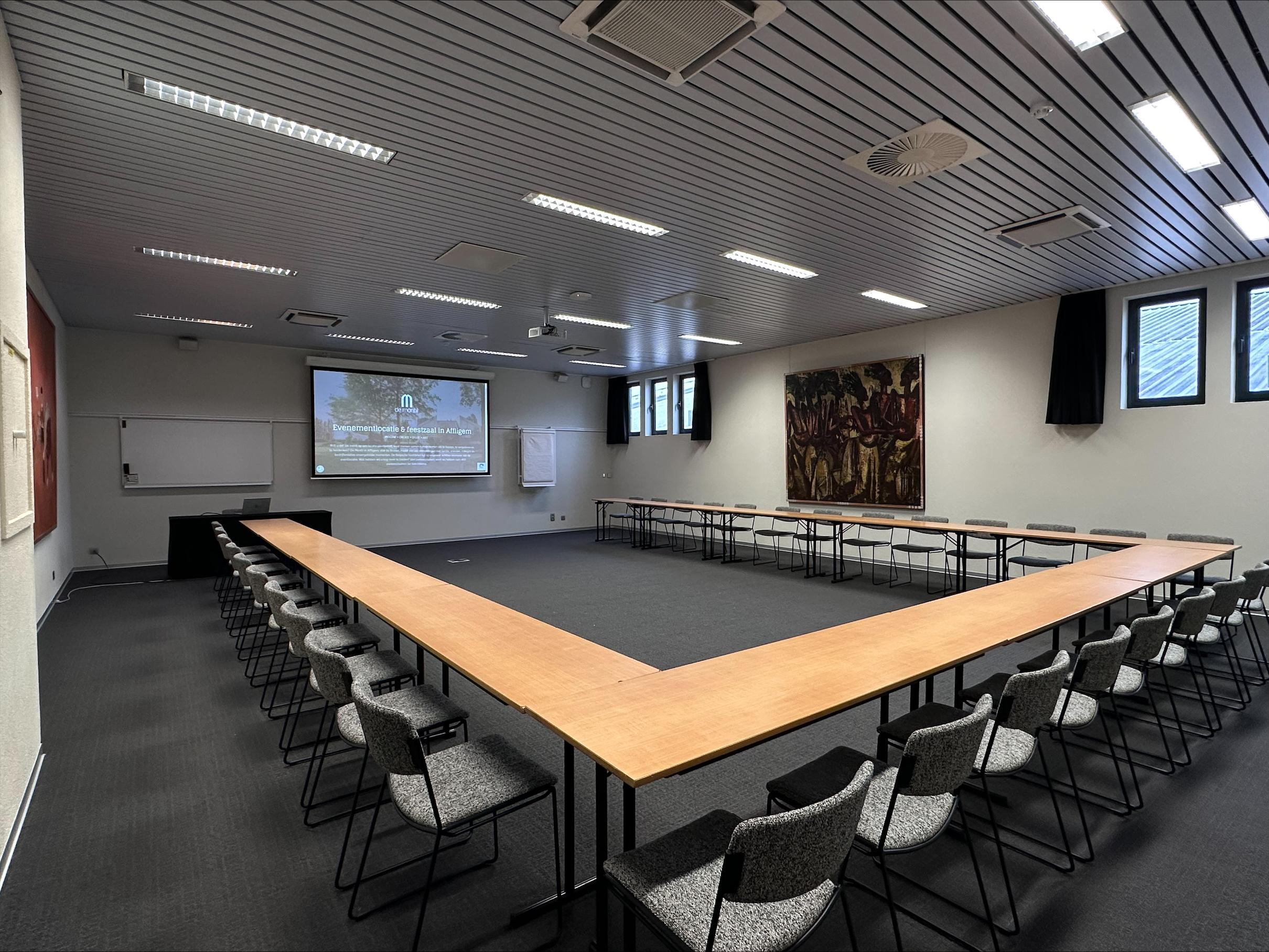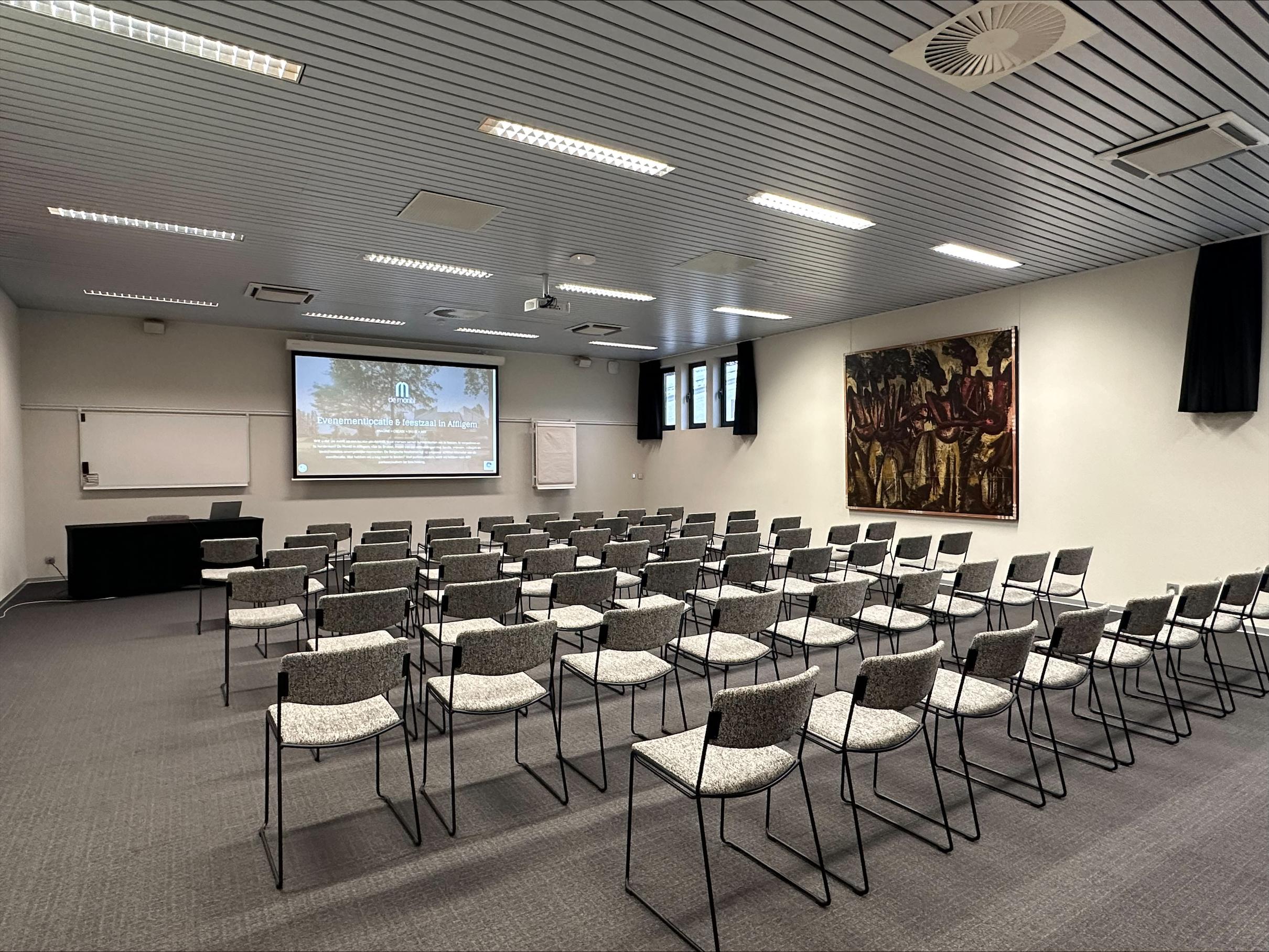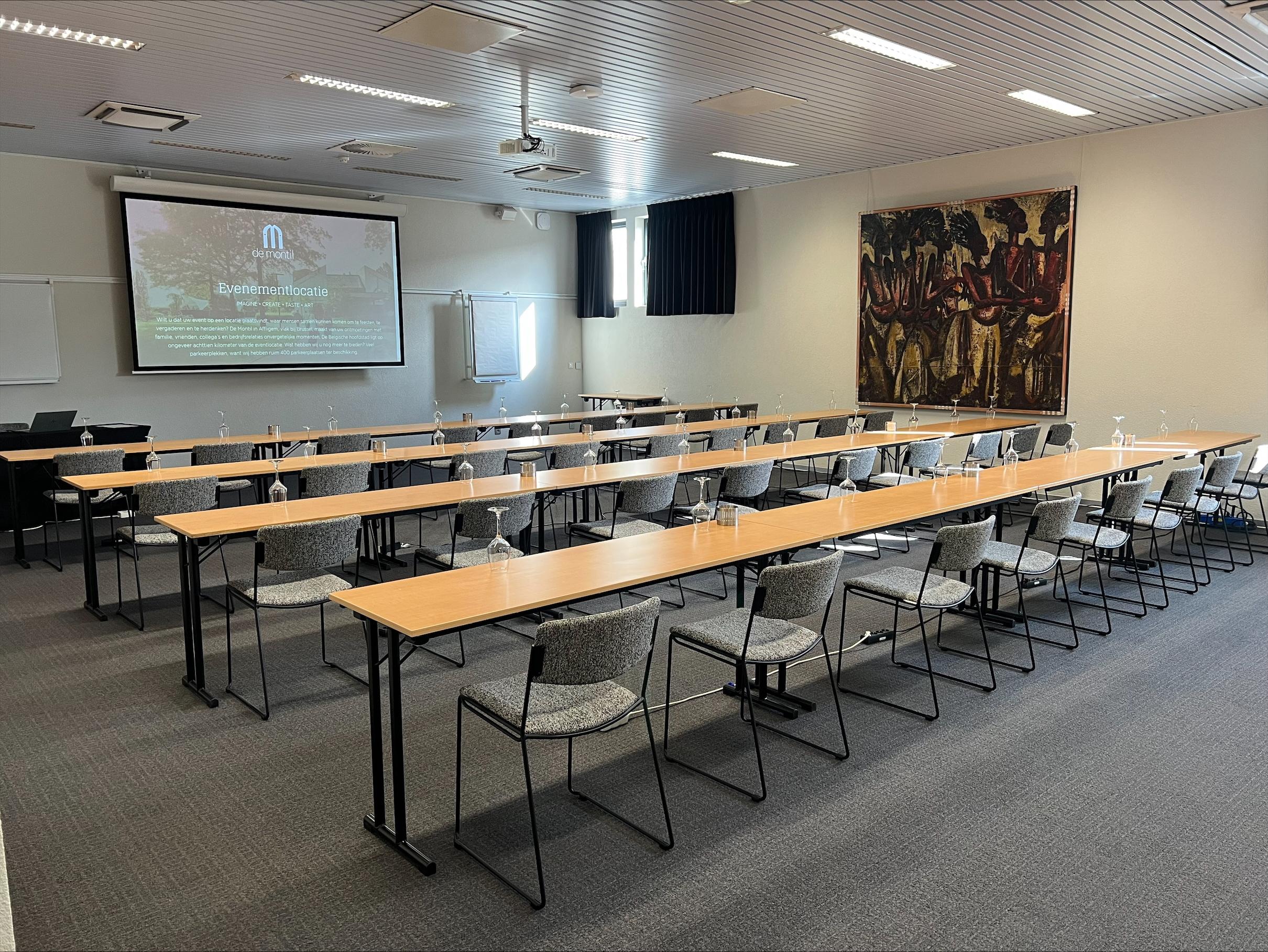 De vele ramen zorgen voor een natuurlijke lichtinval. Doch kan deze zaal volledig verduisterd worden waardoor uw presentatie in de meest optimale situatie kan plaatsvinden.
