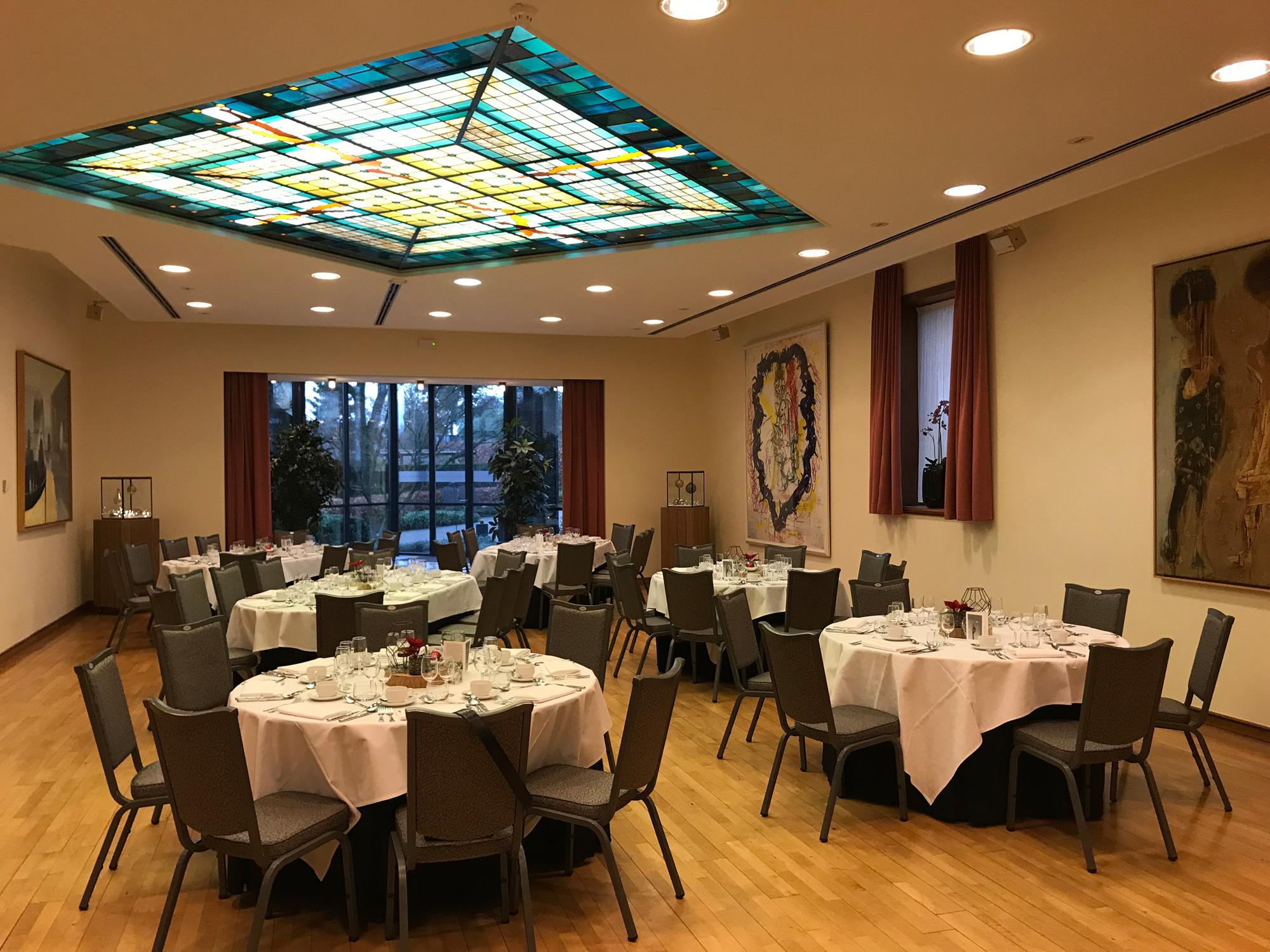 Een grote zaal met parket gelegen op het gelijkvloers. De hoge raampartijen zorgen voor een natuurlijke lichtinval. Doch is de zaal volledig verduisterbaar zodat uw presentatie in de meest optimale situatie kan plaatsvinden. Geschikt voor verscheidene bijeenkomsten zoals lezingen, presentaties, vergaderingen, workshops, diners, enz. Door de geïntegreerde bar biedt deze zaal de mogelijkheid om vergaderen en een after-work drink te combineren of is deze uitermate geschikt voor uw receptie, personeelsfeest, enz.