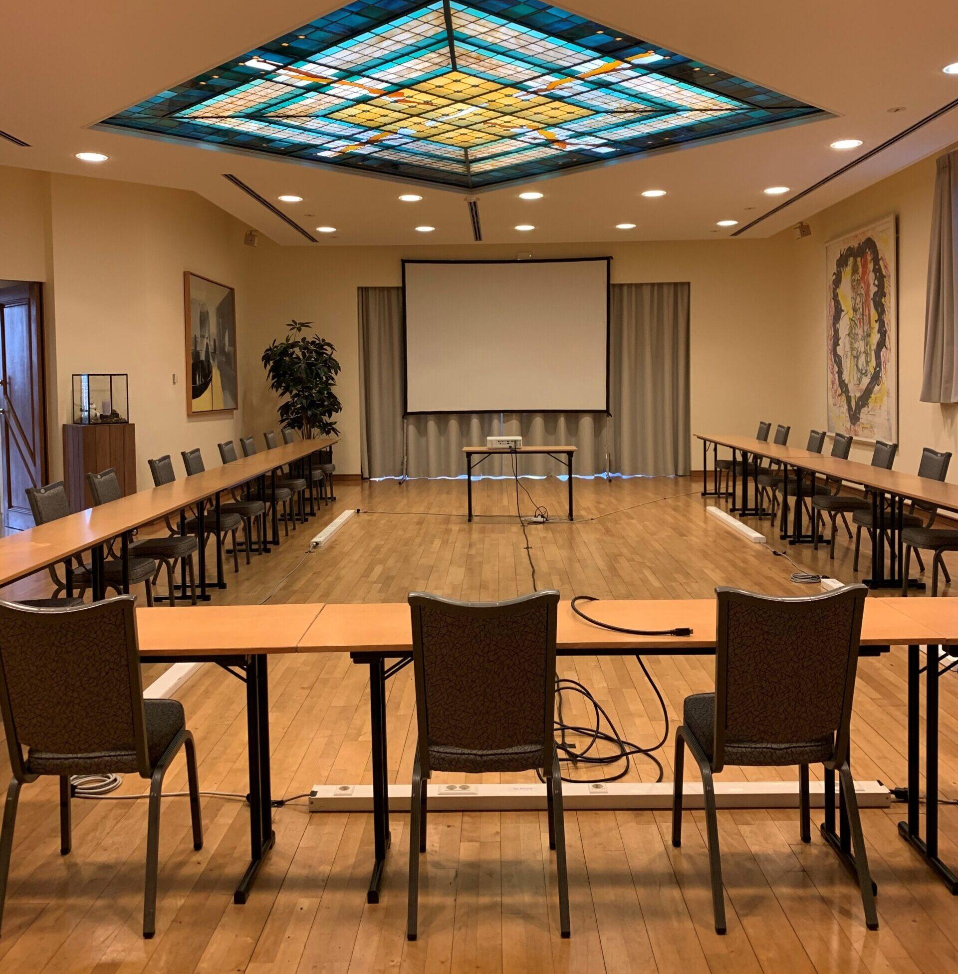 Elke zaal is aangenaam ingekleed en is voorzien van sfeervolle ledverlichting die u kan dimmen of uitschakelen in functie van uw presentatie. Het klimaat kan tevens geregeld worden in functie van uw wensen.