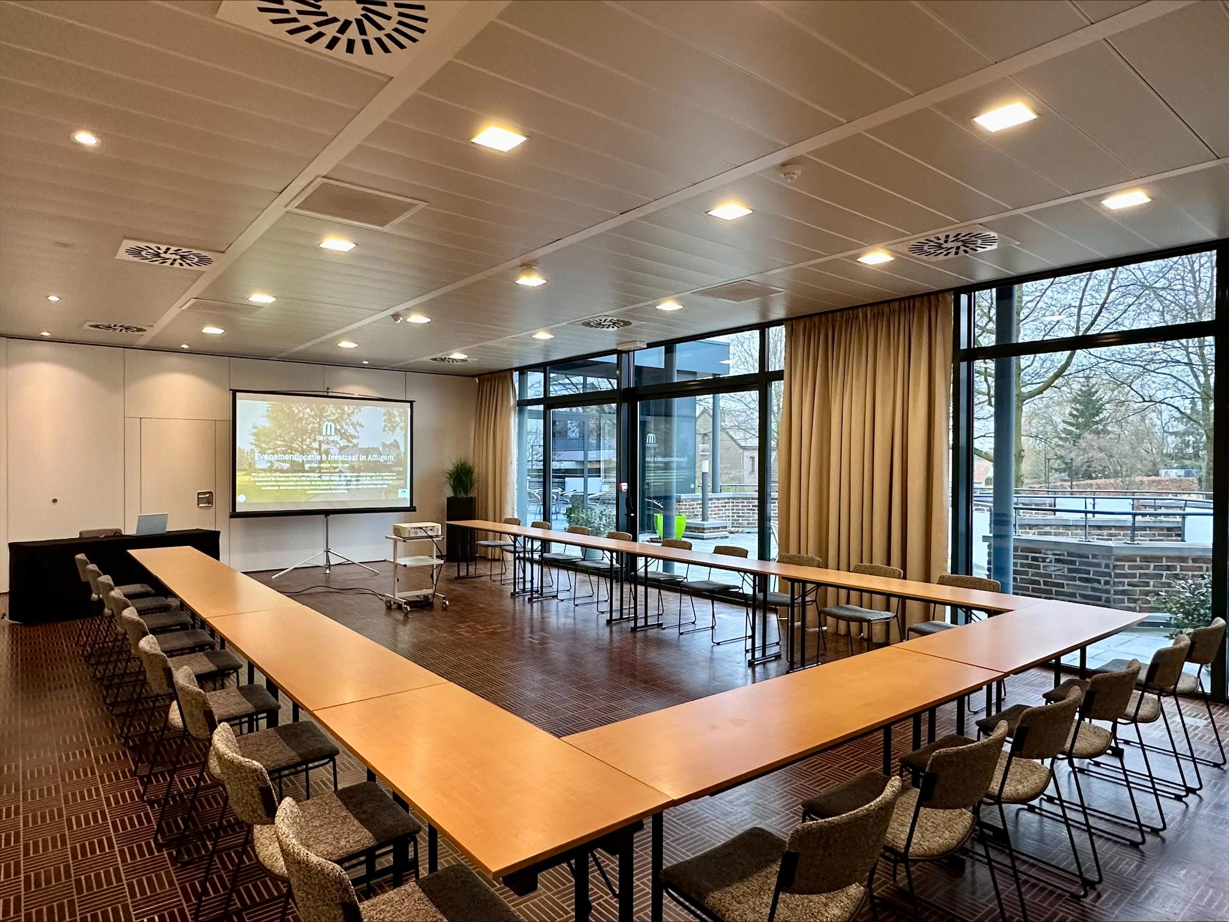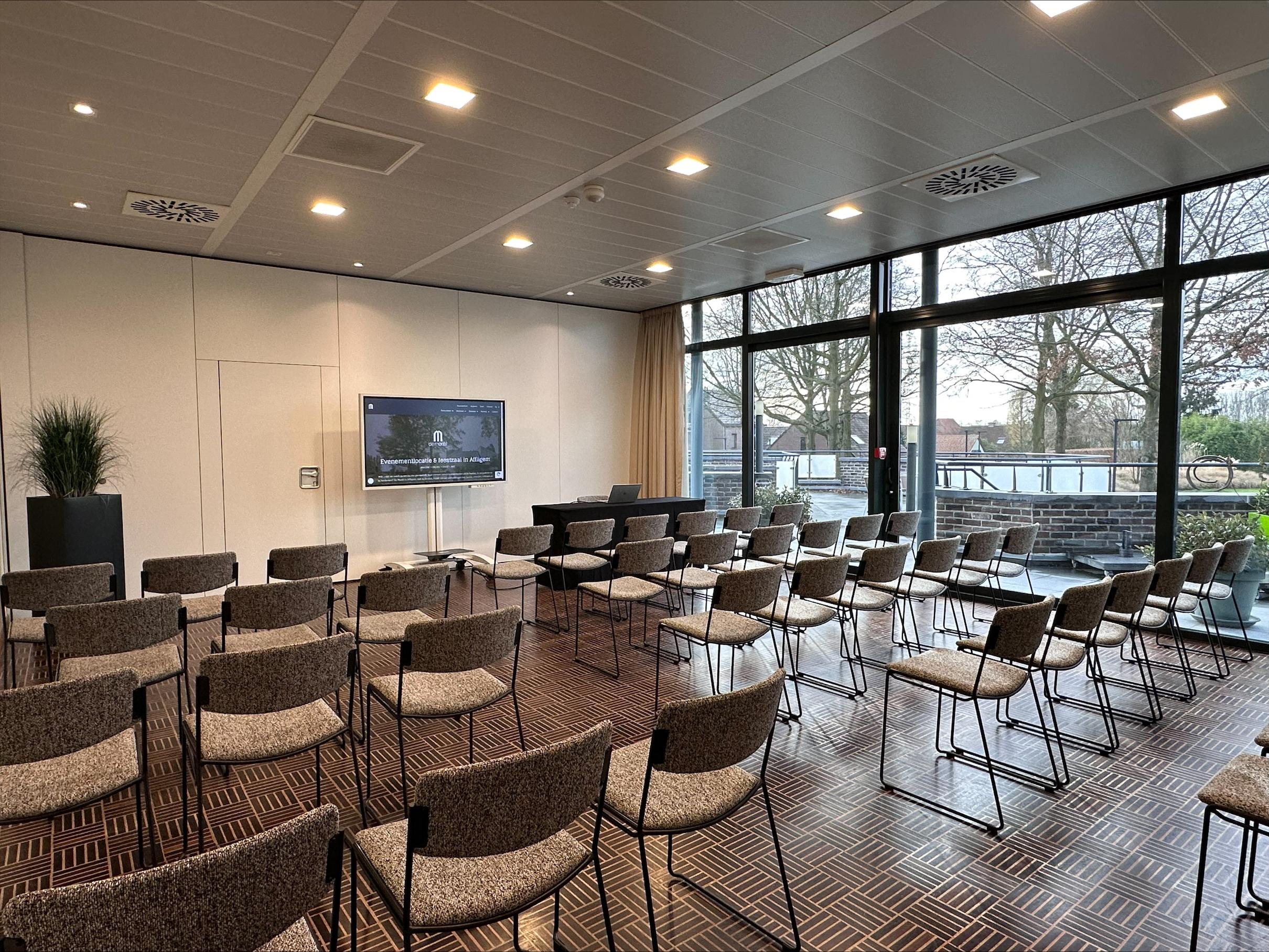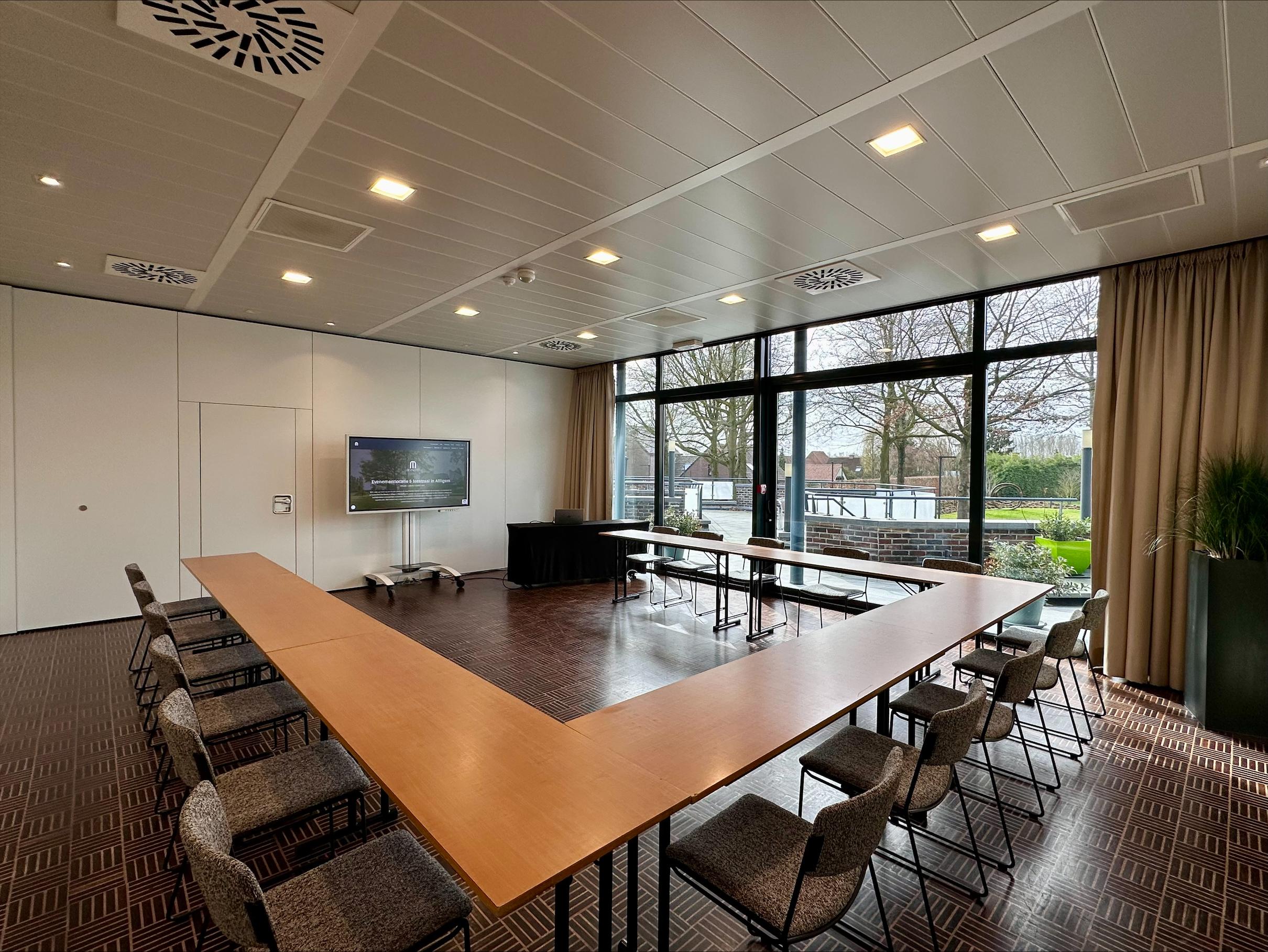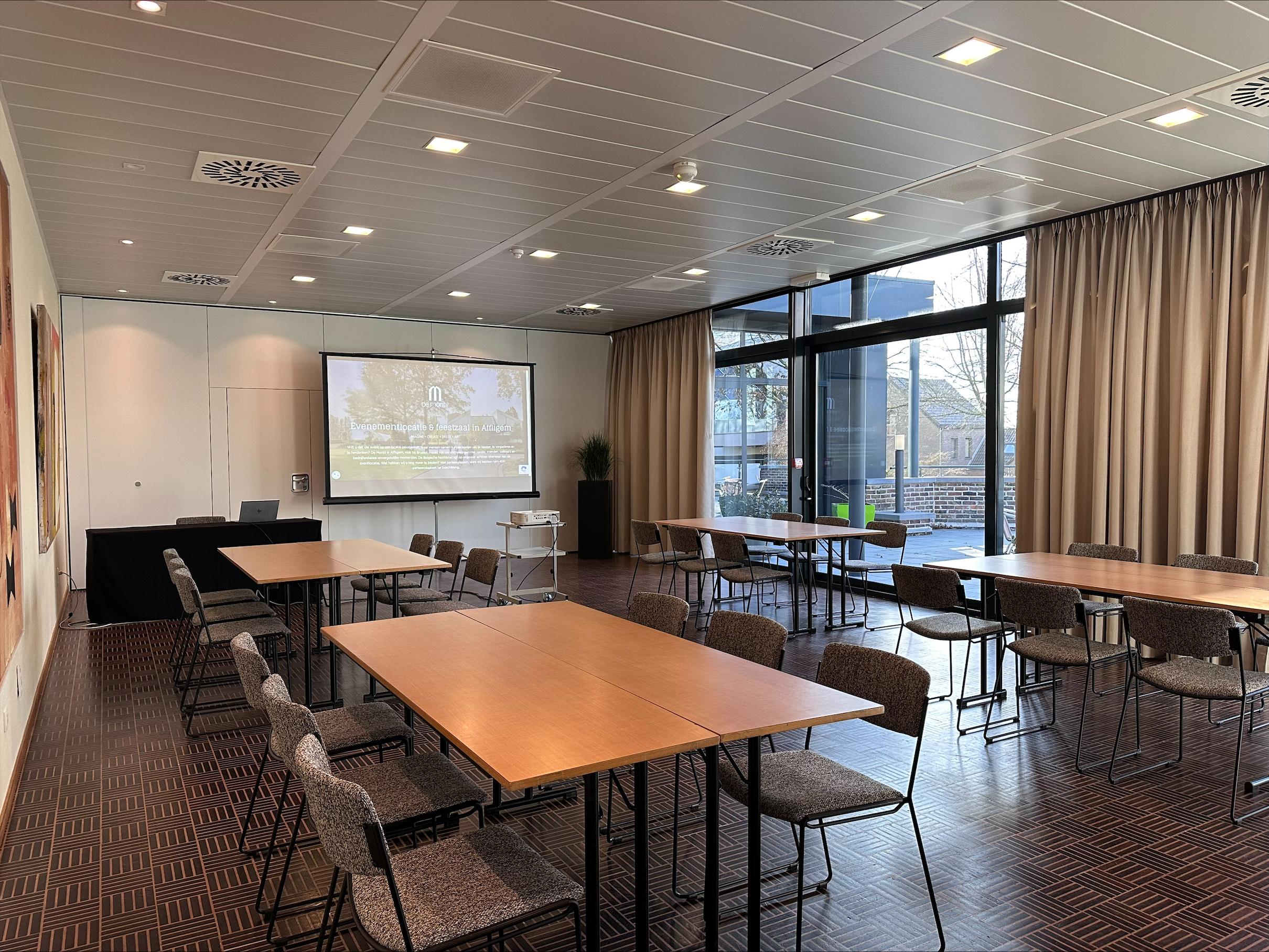 Multifunctionele zaal met parket gelegen op de eerste verdieping. Door de flexibele wand kan deze zaal opgedeeld worden in 2 ruimtes van 48 en 72 m². De grote, hoge ramen zorgen voor een natuurlijke lichtinval en verschaffen een rechtstreekse toegang tot het aanpalende terras vanwaar u een mooi uitzicht hebt op onze beeldentuin. Doch is de zaal volledig verduisterbaar zodat uw presentatie in de meest optimale situatie kan plaatsvinden.